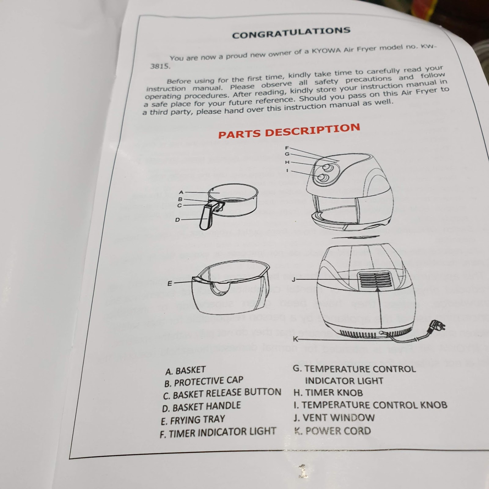 - The Kyowa 7L Air Fryer worked quite well. The body is clad in heat resistant plastic so there is minimal chance of accidental contact with hot surfaces (unless you are taking things out of the basket).